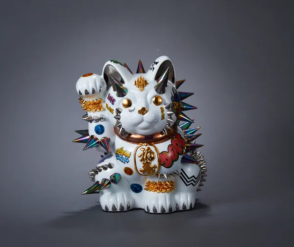 Grounded in centuries-old techniques, Koga deftly fuses bold innovation into his practice, producing a striking beauty of contrasts. He creates wearable ceramics, spiked maneki-neko and daruma, and anything that can “give new ideas a concrete form.” Each of Koga’s works begins with a traditional object, yet ultimately arrives in a “punk samurai” form. His “Neo Maneki-neko” and “Neo Daruma” are among the clearest embodiments of his signature idea: adding spikes.