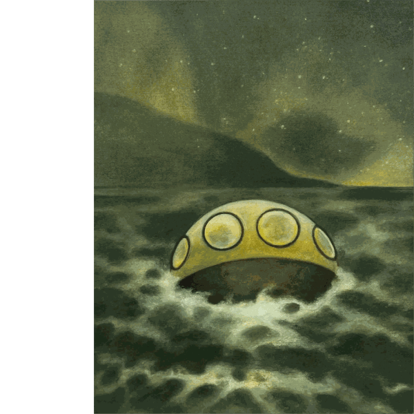 Corinne’s paintings make a compelling connection between past and future. There are clear roots of this work in her previous under-sea images. Like most of her earlier work, these images are very rich in metaphors and symbolism, and directly address the subconscious. If one wants to speak in the language of alchemy, the work now connects all primeval alchemical elements, beyond water, also earth, air, and fire. The symbolism in the paintings often alludes to the past (a historic cabin, a Jules-Verne-inspired capsule, a historic diving helmet) or the here-and-now, but the implications or implied conjectures reach well into the future, referencing precarious environmental changes and predicaments.