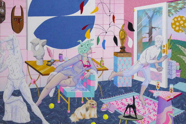 Justin Yoon (b. 1991, Los Angeles, California) is a Brooklyn based painter. Justin holds a B.F.A in Illustration from Parsons School for Design, NY. Early childhood memories of American junk food, late night old Hollywood movies on the TV, and listening to jazz in the car with his family on long drives significantly affected him to create a world of romantic melancholia, synthetic colors, and casual lostness of being. With no specific emotions provoked, the group of characters reoccur over and over in a deeply synthetic yet ambiguous dream-like landscape, continuing on this never ending "Highschool Reunion". The viewer becomes a part of this experience, which is vaguely both universal yet deeply personal.