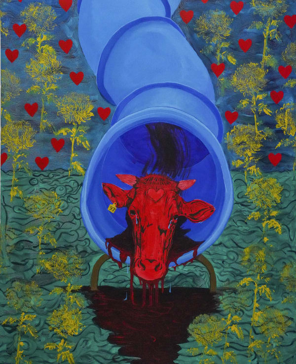 Michael Thế Khôi Trần (b.1997, Ox) is an interdisciplinary artist who resides in Los Angeles/Orange County. He received his BFA in Drawing and Painting from California State University, Long Beach. Tran’s work explores his Vietnamese asexual identity introspectively in the setting of a playground. Tran references the iconography of an ox as a self-portrait of a misunderstood self; helpless and ensnared in his playground. Tran collages layers of patterns and repetition in his work to manipulate the spaces within the subject and the background to force tension and vibration. The repeating patterns stem from a vicious cycle where one has to break out, or surrender to the fear.