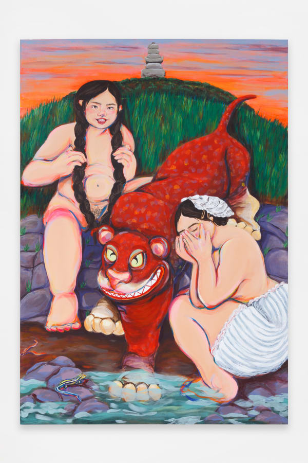 Daieny Chin is a Korean-American artist who was born in 1994 in São Paulo, Brazil. They graduated from San Francisco Art Institute in 2018 with a BFA in painting. Daieny currently resides in Los Angeles, California, and continues to create introspective works that bridge the gaps of identity, culture, personal narratives, and human connection within the Korean diaspora. Incorporating the themes of Korean culture, shamanism, mythology, intergenerational trauma, and the representation of matriarchs within their family, their paintings explore the power dynamics, resilience, and the emotional terrain of their experiences. Through the use of shamanism and Korean mythology, Daieny links the connections between myth, spirituality, and reality. This allows them to create fantastical narratives that reflect both personal and collective experiences of the Korean diaspora, while illuminating the complexities of identity and heritage.