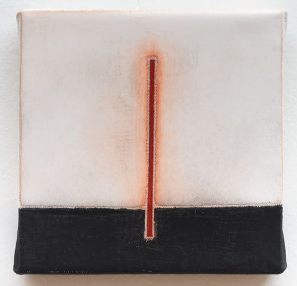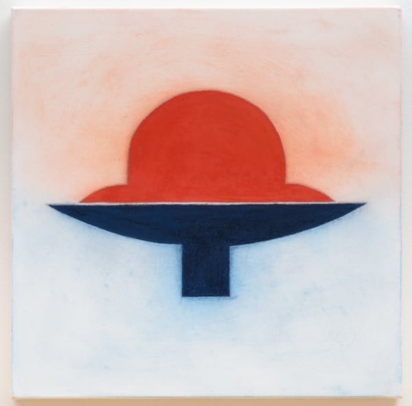 Starting in 2018 Hill decided to paint larger compositions and his use of paper became secondary to the use of the white stabilizing material that he had been using, gesso. The artist discovered that he could burnish the gesso to a low gloss and intensify the color saturation of the images. Hill also started combining geometric shapes into conglomerations that could be interpreted as recognizable images. “That was a happy accident that led me in 2019 to paint objects that I encountered in my day-to-day life,” said Hill. At about the same time he started adding dark horizon lines or a dark halo around the central image. Accordingly, his work since 2021 has incorporated objects sitting on a black horizon.